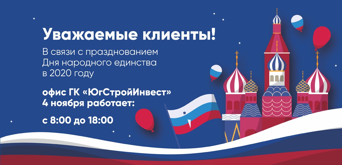 Друзья, близится День народного единства. Этот праздничный день - отличное время, чтобы посетить офис продаж ГК «ЮгСтройИнвест» и выбрать квартиру. Для вашего удобства мы будем работать по обычному графику.