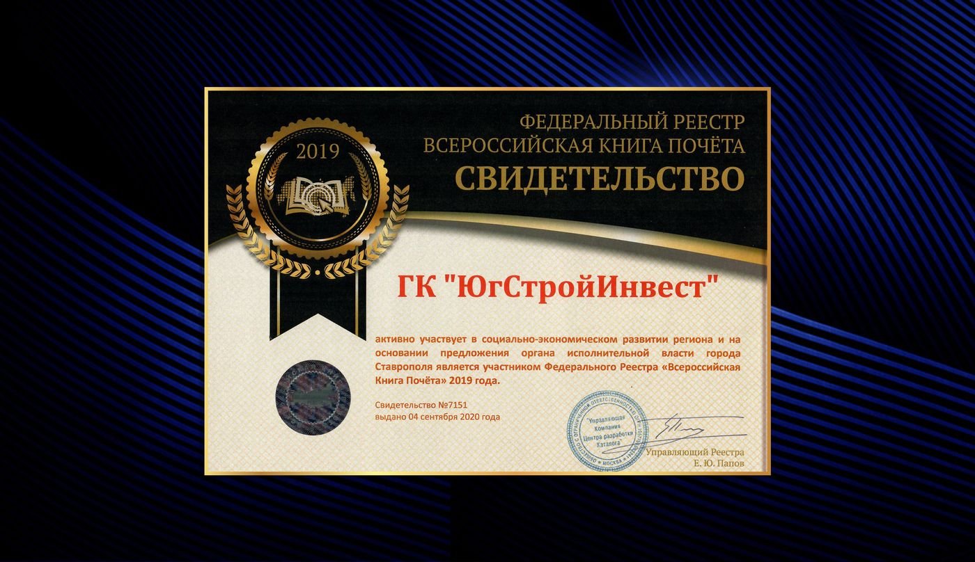 Завершилось формирование Федерального Реестра “Всероссийская Книга Почета” за 2019 год. Лидер строительной отрасли - группа компаний “ЮгСтройИнвест”, вошел в этот Реестр в четвертый раз.
