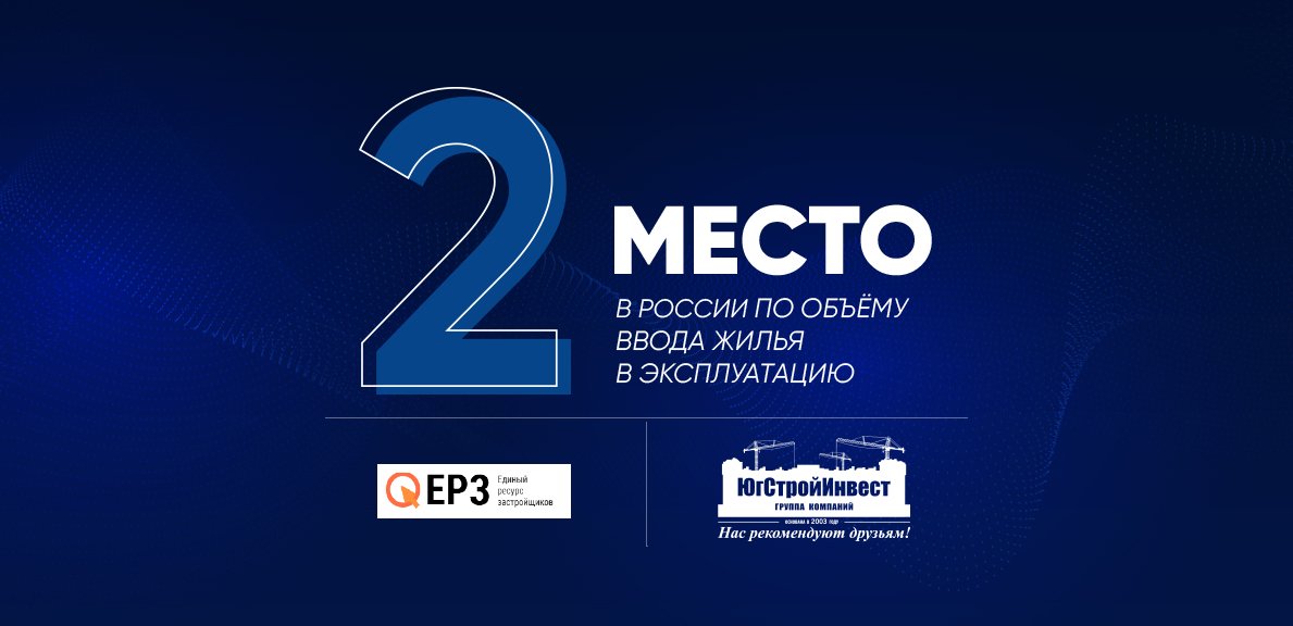 Портал Единого ресурса застройщиков РФ обновил ТОП застройщиков по объемам ввода жилья. Второе место в Российской Федерации занимает группа компаний “ЮгСтройИнвест”. С начала года компания ввела 320 тысяч кв. м жилья, а до конца года планирует ввести еще 21 тысячу кв. м.