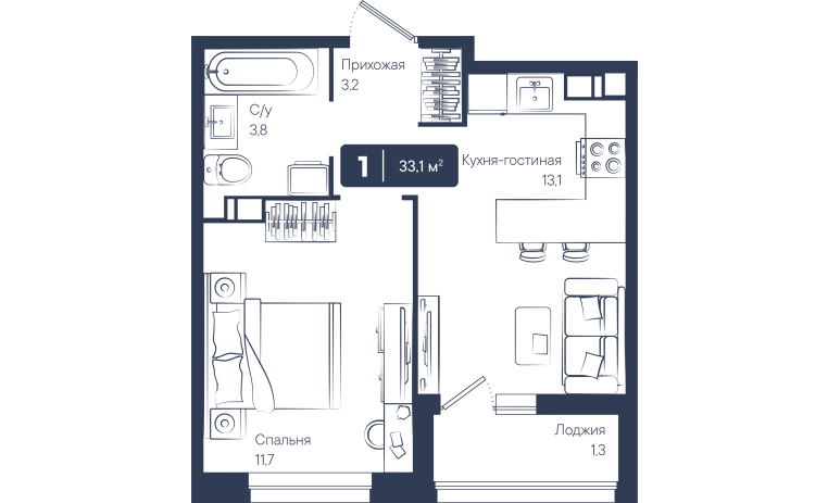 1-комнатная квартира 33,10 м2